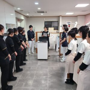今日の患者さまの注意点やタイムスケジュールをみんなで確認しています。